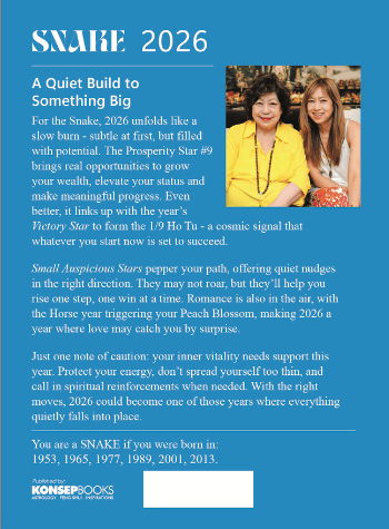 2026 is a year of steady yet powerful growth for the Snake. With the Prosperity Star #9 lighting your path, opportunities to increase wealth, expand influence, and elevate status quietly build throughout the year. The energy may not roar, but it delivers meaningful progress—especially with the Victory Star aligning to ensure that what you set in motion reaches success.