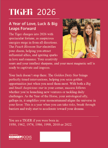 2026 is a year of love, luck, and bold strides for the Tiger. With the Peach Blossom Star shining brightly, your natural charm is magnetic, drawing allies, opportunities, and romance your way. Creativity and intellect flourish, helping you leave a strong impression wherever you go.